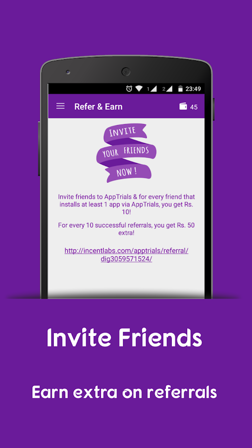 - Click on the menu situated upper left side and click " REFER AND EARN " and share to your friends and family and you will get Rs.10 / Share after they complete one app offer.